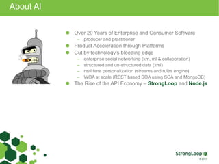 The document discusses StrongLoop, a company co-founded by Al Tsang that focuses on Node.js and its role in the API economy, highlighting its capabilities in building fast, scalable applications. It presents various integration solutions such as LoopBack, emphasizing features like model-driven architecture and automated REST API generation. Additionally, it addresses challenges in the evolving landscape of APIs, cloud, and IoT, while showcasing StrongLoop's competitive advantages through performance metrics and integration tools.