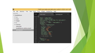 Node-Webkit is an application runtime that enables the creation of desktop applications using web technologies like Chromium and Node.js. It allows developers to package their web apps into native applications for multiple platforms by following a simple three-step process. Additional features include support for native modules, basic window functions, and embedding libraries for enhanced functionality.