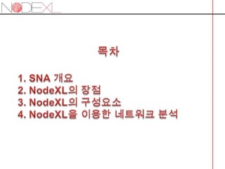 * This slidewas made by Han Woo Park and his students to help Korean users use the NodeXL새로운 네트워크분석 도구 NodeXL이 슬라이드는 Marc Smith, Analyzing Social Media Networks with NodeXL의 3,4장을 기초로 한국 이용자들이 노드 엑셀을 쉽게 사용할 수 있도록 만든 매뉴얼임. 노드엑셀 최근 버전을 사용했으며 사례 또한 원제와 상이함.이 매뉴얼을 이용할 때에는 다음과 같이 밝혀 주기바람.김지영, 왕정, 박한우 (2010). 노드엑셀을 이용한 소셜 미디어 네트워크 분석. 경산: 영남대학교. 목차SNA 개요NodeXL의 장점NodeXL의 구성요소NodeXL을 이용한 네트워크 분석