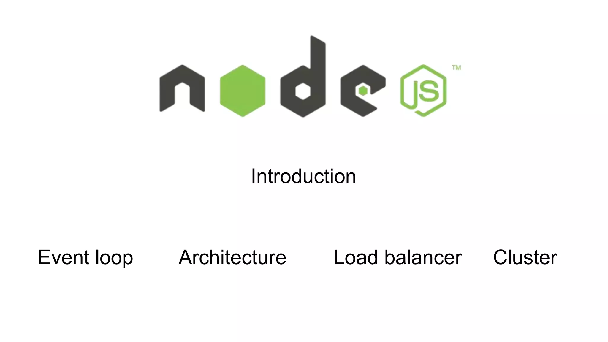 This document discusses Node.js and its event loop model. It explains that Node.js uses a single-threaded event loop model that handles concurrent connections through non-blocking I/O and event callbacks. It also discusses how the cluster module allows Node.js applications to take advantage of multi-core systems by load balancing workers across CPU cores.