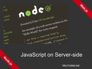 Web.js Node.js Web.js的 API 是全裸的 Node.js 原生代码可以无缝迁移 //Node.js 官方 Hello World var http = require( 'http' ); http. createServer (function ( req , res ) { res. writeHead ( 200 , { 'Content-Type' : 'text/plain' }); res. end ( 'Hello World\n' ); }). listen ( 1337 , "127.0.0.1" ); //Web.js var web = require( 'webjs' ); web. run ({}, 1337 , '127.0.0.1' ) . get ({ '/' : function (req, res) { res. end ( 'Hello World\n' ); //res.send('Hello World'); } }); - 22.