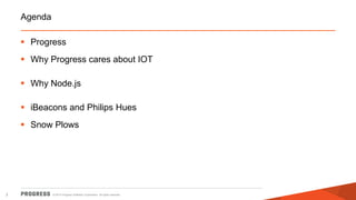 The document discusses the advantages of using Node.js as a bridge for Internet of Things (IoT) applications, emphasizing its scalability, efficiency, and strong developer community. It highlights various applications in IoT, including ibeacons, smart home devices, and snow plow management, showcasing how Node.js can facilitate real-time data handling and API-first architectures. The presentation also outlines Progress Software's products and their integration capabilities with IoT technology.