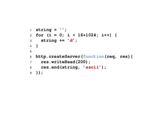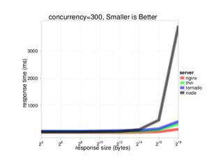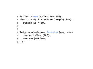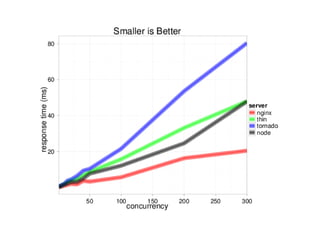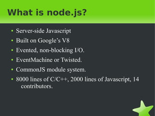 Node.js is a server-side JavaScript environment built on Google's V8 engine, designed for event-driven, non-blocking I/O to support highly concurrent applications. Unlike Apache, which uses one thread per connection, Node.js employs an event loop for handling multiple connections efficiently. Key design goals include low-level operations, stream-oriented data handling, and familiar APIs for both client-side JavaScript developers and Unix programmers.