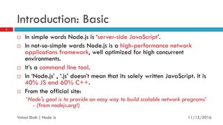 Node.js is a JavaScript runtime built on Chrome's V8 JavaScript engine. It allows JavaScript to be used for server-side scripting by providing asynchronous and event-driven capabilities. Some key points about Node.js covered in the document include: