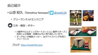Yamazoe) @zoe6120 • フリーランス IoTエンジニア • 工作・模型・ギター • IT業界やビルディングオートメーション業界でオープン 技術による機器・設備のIoT化に取り組んでいます。 • データセンタ機器メーカー、BAデバイスベンダを経て フリーランス Node-RED UG 勉強会2019年末LTパーティ 2 ブログ https://zoe6120.com/