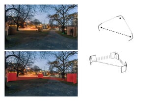 2) Parc de la Villette in Paris by Bernard Tschumi Architects, which manifested Tschumi's theory of deconstructivism through follies (nodes) of different functions that navigate users through the park and are organized by a grid. The projects explore relationships between nodes, paths, and integrating structural and spatial networks.