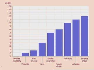 Noise pollution can negatively impact human health and quality of life. Unwanted sound that is loud or persistent enough can damage hearing or cause annoyance. Common sources of noise pollution include transportation like vehicles, aircraft, and trains, as well as industrial operations, construction, and recreational activities. The ear converts sound vibrations into nerve signals that are perceived by the brain as sound. Noise is measured in units called decibels and standards aim to limit exposure and emissions from various sources.