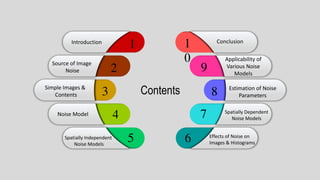 1) The document discusses various types of noise models that can affect digital images, including spatially independent noise models like Gaussian, impulse, uniform, Rayleigh, gamma, and exponential noise.