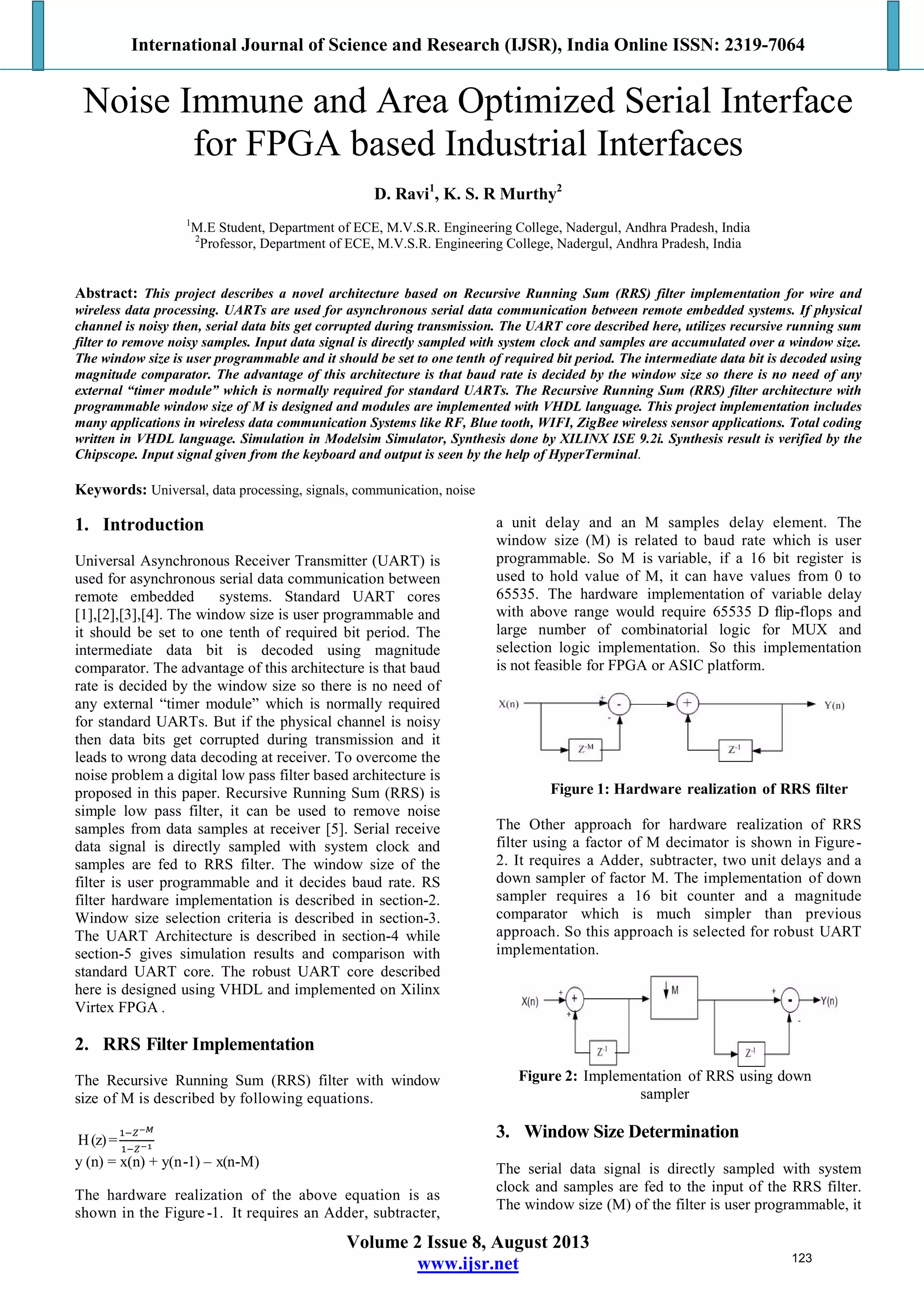 This document presents a robust architecture for Universal Asynchronous Receiver Transmitters (UARTs) using a recursive running sum (RRS) filter to enhance noise immunity in serial data transmission. The proposed method allows for programmable baud rates based on the window size of the filter, eliminating the need for a separate timer module, and it is implemented in VHDL on an FPGA. Simulation results demonstrate that this UART design performs better than standard UARTs under high noise conditions while occupying minimal FPGA resources.