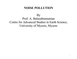 The document discusses noise pollution, defined as undesirable or unwanted sound that poses significant risks to health and the environment. It covers the characteristics and sources of noise, its measurement through decibel levels, and its harmful impacts, such as hearing loss and stress. Methods for controlling noise pollution are also outlined, including industrial controls, community involvement, and legislative measures.