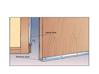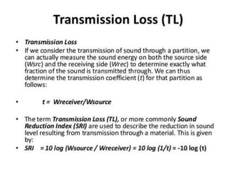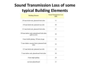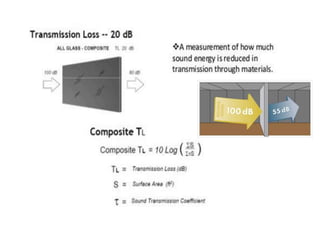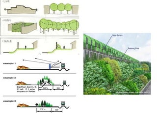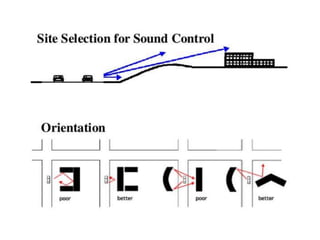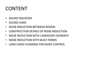 This document discusses various methods for noise reduction in architectural design. It covers sound isolation techniques like using solid doors, double pane windows, and sealing openings. It discusses reducing sound transmission between rooms by following construction standards. Specific techniques are mentioned like using mass barriers, resilient channels, and soundproof drywall. Landscape elements can absorb sound through plants' leaves, branches and bark. Built forms like balconies and screen walls can reflect or block noise. Land use planning allocates noisy and quiet uses to different zones to prevent noise exposure. The document recommends identifying the noise source, measuring sound levels, and using appropriate absorbing materials to solve noise control problems.