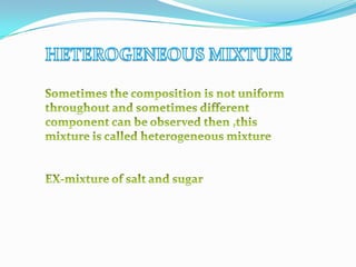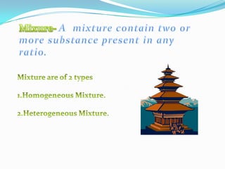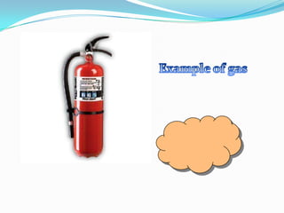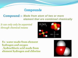 Matter can exist in three states - solid, liquid, and gas. In a solid, the particles are closely packed together with strong intermolecular forces between them, giving the solid a definite shape and volume. In a gas, the particles are far apart with weak intermolecular forces, allowing gases to expand to fill their container. Matter can also be classified as elements, compounds, or mixtures depending on its chemical composition. Elements are made of only one type of atom, while compounds contain different types of atoms bonded together, and mixtures contain elements or compounds not bonded together.