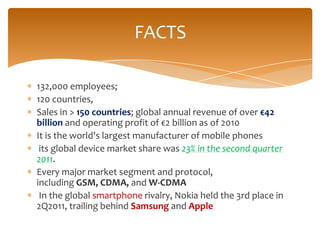 Nokia is the world's largest manufacturer of mobile phones with 132,000 employees in over 120 countries. In 2010, Nokia had global annual revenue of over €42 billion and operating profit of €2 billion. Nokia held 23% of the global device market share in 2011, placing it third in the global smartphone market behind Samsung and Apple. In 2011, Nokia announced a partnership with Microsoft where all future Nokia smartphones will run on the Windows Phone 7 platform. This led to an 11% decline in Nokia's stock price and a 40% drop in profits, turning to an operating loss in Q2 2011. Nokia unveiled its first Windows Phone 7.5 devices, Lumia 710 and 800, in October 2011.