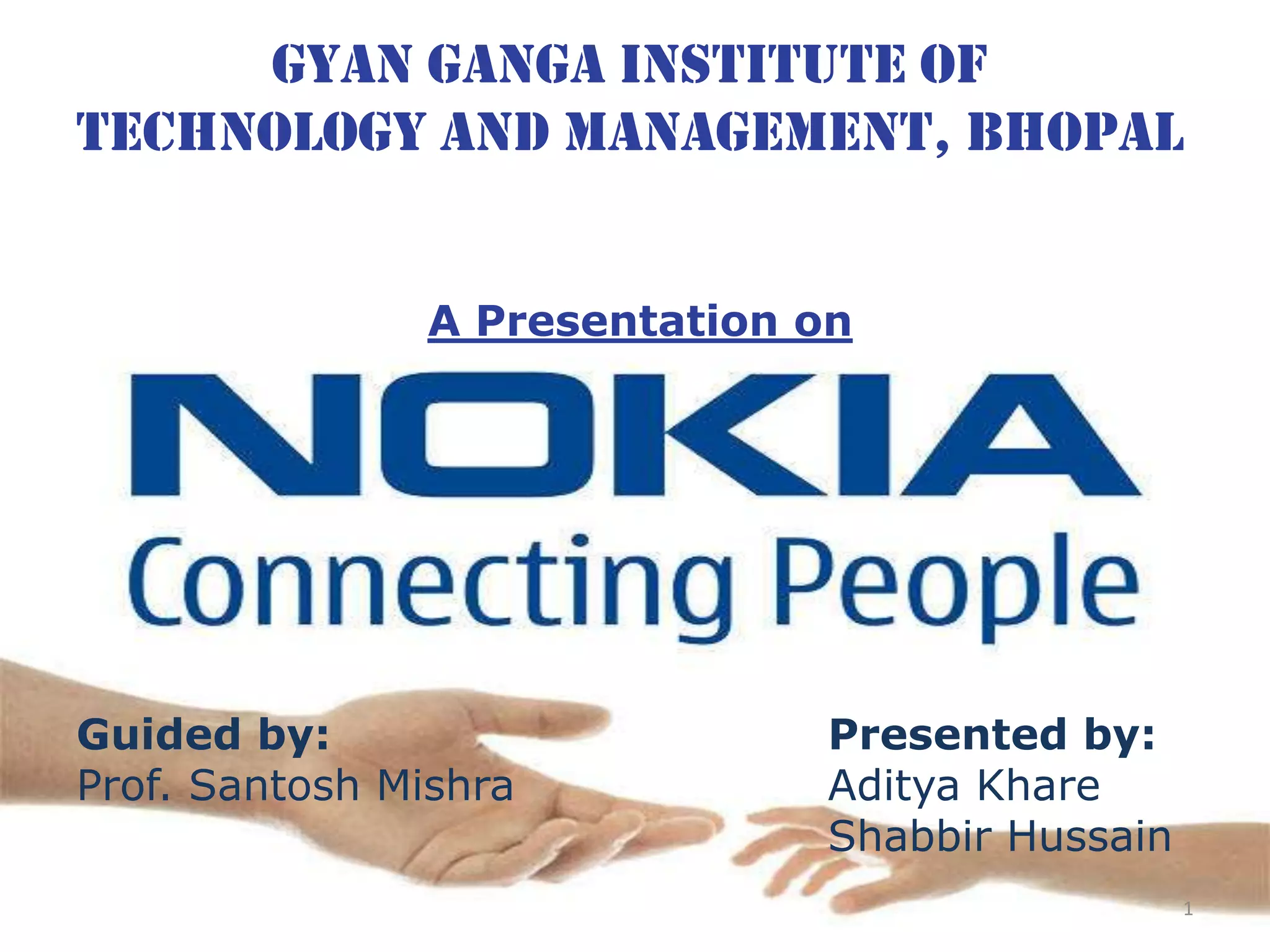 Nokia is the world's largest manufacturer of mobile phones since 1998. The presentation provides a brief history of Nokia, starting as a pulp, rubber, and cable manufacturer in 1865 in Finland. It summarizes Nokia's logo changes and market leadership over time. A SWOT analysis identifies strengths in global marketing and quality, weaknesses in outdated operating systems, and opportunities in new software and markets.
