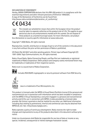 This 3 sentence summary provides the key information from the Nokia 6151 User Guide document: The document is the user guide for the Nokia 6151 mobile phone and includes the declaration of conformity, stating that the RM-200 product complies with European Union directives. It also notes that in the EU, the device must be collected separately and not disposed of as unsorted municipal waste at its end of life. The document provides copyright information and prohibits reproduction without permission from Nokia.