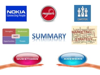 Nokia started as a paper mill in 1865 and diversified over time, producing various electronic devices including radios, TVs, and computers. It faced near bankruptcy after WWI but joined with other companies. From 1992 onward, it focused solely on telecommunications. It has faced challenges entering new markets, fierce competition, and struggles to expand. Nokia uses the Symbian operating system in many of its phones and acquired Symbian in 2008. However, critics say it offers poor after-sales service and was slow to enter the smartphone market. It also needs to ensure affordability and expand its product range and features to capture more markets.