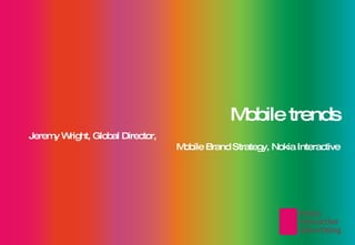 Mobile phone usage and smartphone adoption is growing rapidly globally. Key trends include the rise of smartphones and apps, consumers expecting instant engagement and rewards for their participation, and the increasing personalization of services based on individual preferences and location data. Brands are exploring new mobile marketing approaches like sponsored apps and location-based services to engage consumers in this evolving "clickable world".