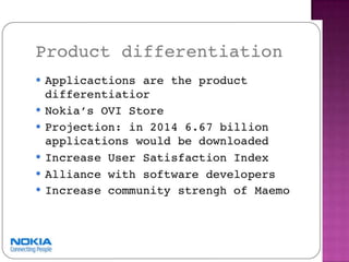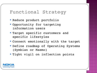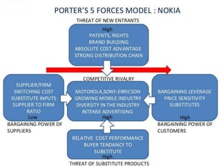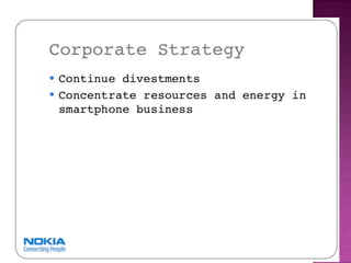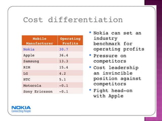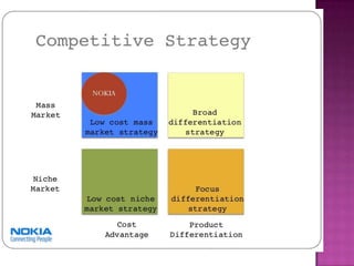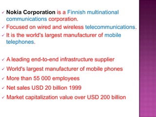 Nokia Corporation is a Finnish multinational telecommunications company that is the world's largest manufacturer of mobile phones. It has over 55,000 employees and annual revenue of €40.99 billion in 2009. Nokia connects people through innovative mobile device products like phones and networking equipment. It has held the largest market share for mobile phones since 1998 but faces increasing competition from companies like Samsung and Apple. Nokia's success is due to core competencies in research and development, brand development, mass production, and identifying market needs.