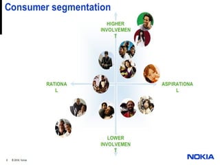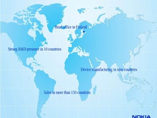 The document summarizes Nokia Corporation, the multinational telecommunications company headquartered in Espoo, Finland. It discusses Nokia's vision of enabling anything mobile, its mission to connect people around the world, and its historical success as the world's largest manufacturer of mobile phones, employing over 39,000 people in research and development. The document also provides an overview of Nokia's business strategies, including its product portfolio, pricing, placement, promotion and quality initiatives.