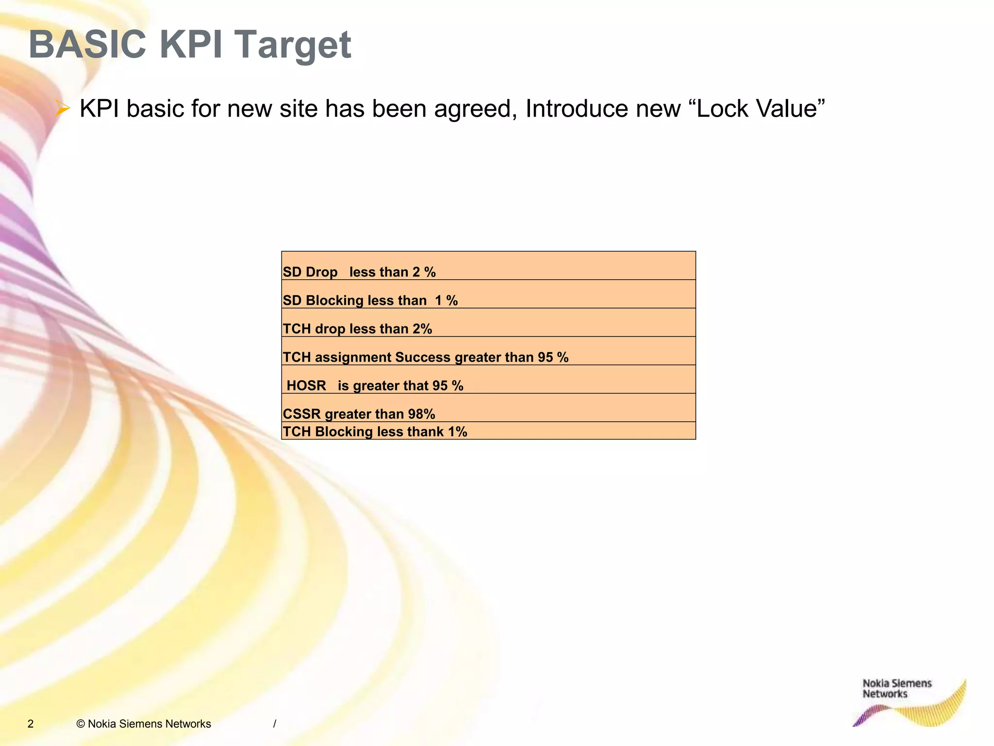 The document provides guidance on optimizing key performance indicators (KPIs) such as call setup success rate (CSSR). It discusses analyzing CSSR by examining its components like SDCCH drop rate. A high SDCCH drop rate can be caused by hardware issues, interference, or transmission problems. The document recommends checking specific counters and alarms to determine the root cause, and describes potential fixes like moving SDCCH channels or adjusting parameters. Overall, the document outlines a process for identifying underperforming cells, analyzing relevant KPIs and counters, and addressing issues to improve network optimization.