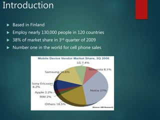 This case study focuses on Nokia's marketing strategies and challenges in the cell phone industry, highlighting its strengths, weaknesses, opportunities, and threats. Despite being a market leader with a 38% share in Q3 2009, Nokia faces fierce competition, particularly in North America, where it holds only 10% market share. Recommendations for improvement include enhancing cooperation with operators and adapting to smartphone trends to better meet consumer needs.