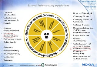 Nokia is developing a global network of recycling companies to handle end-of-life mobile phones and accessories. Strict requirements are placed on these companies to ensure recycling is done in an environmentally compliant way. Nokia also runs various take-back and recycling programs for customers, including mail-in envelopes and drop-off events, to make recycling easy and raise awareness of options other than throwing devices away. External factors are increasing pressure on companies to meet new environmental standards around the world for substance restrictions, recycling, and other sustainability issues.