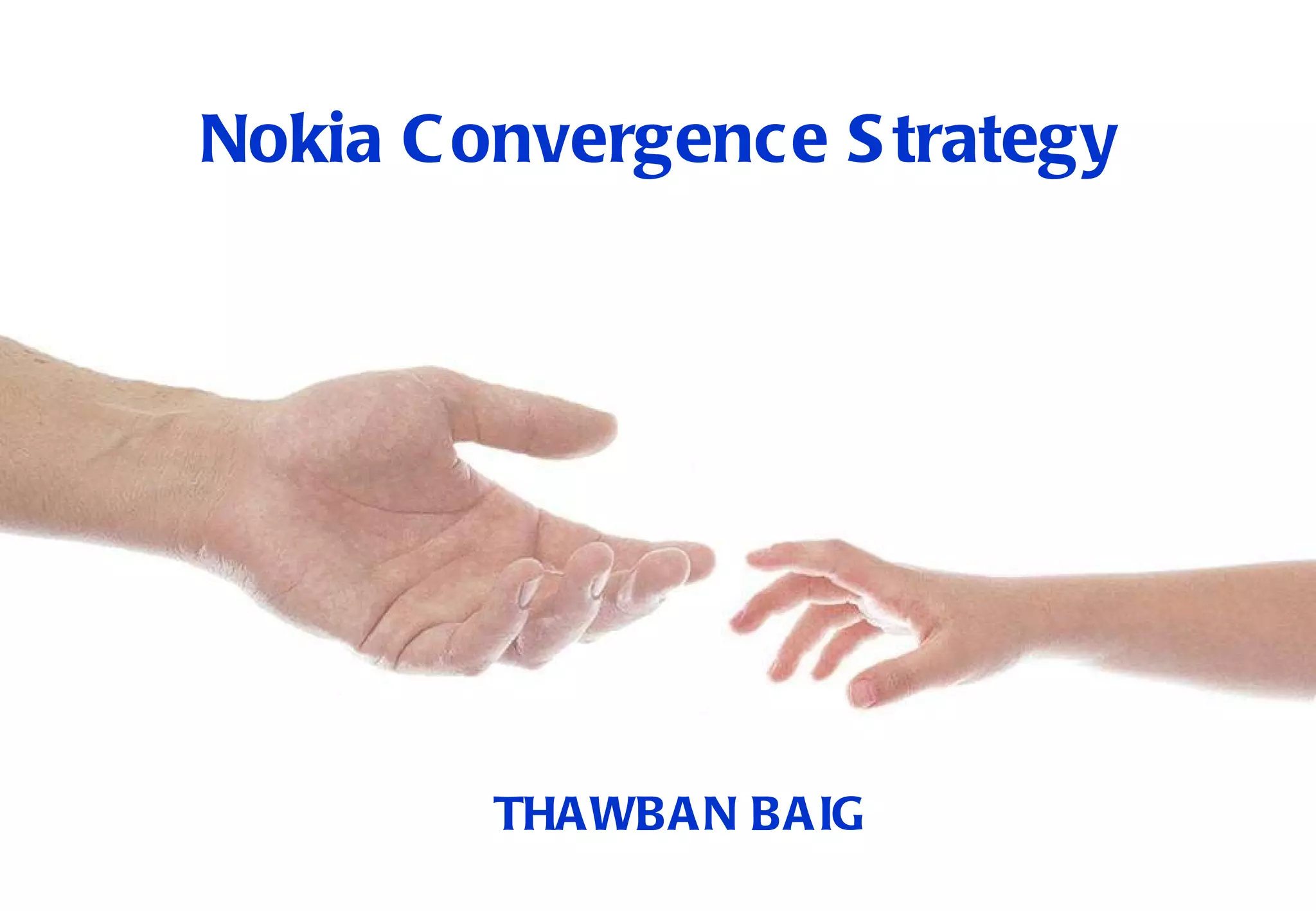 The document discusses Nokia's convergence strategy to address challenges in the mobile phone industry. It notes lower prices and margins, tougher competition, and the need for new value-added businesses and experiences beyond basic phones. Nokia's strategy involves expanding into new networks, multimedia experiences, and technologies through partnerships and acquisitions. The strategy aims to complete new business value propositions and gain credibility in new areas through partnerships with companies in areas like cameras, gaming, and software.