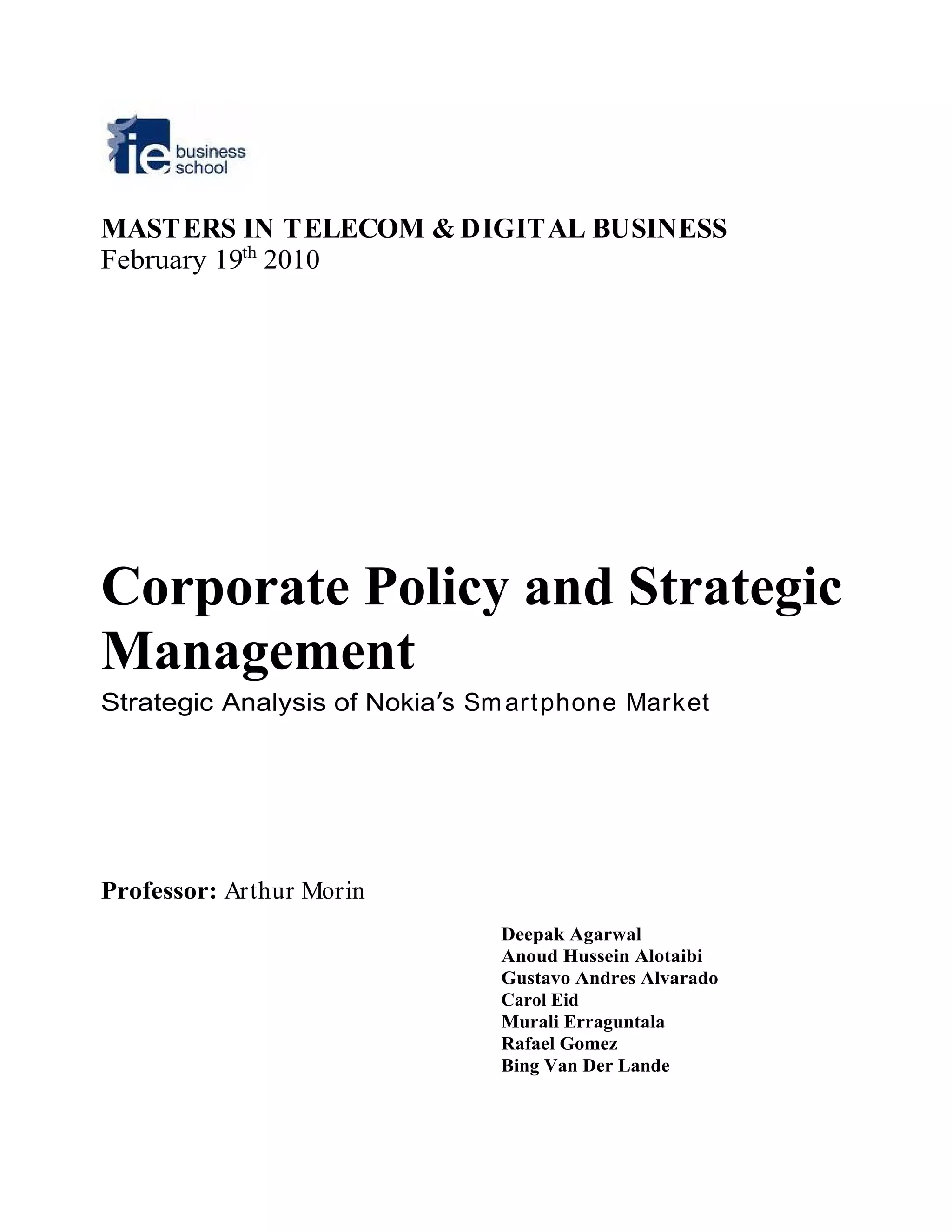 The document provides a comprehensive strategic analysis of Nokia's position in the smartphone market, highlighting its rapid decline in market share despite being a leader in the overall mobile industry. It includes industry analysis through Porter's five forces, SWOT analysis, and product comparisons, identifying key issues such as poor user experience, lack of targeted marketing, and ineffective product differentiation. The overall focus is on formulating strategies to help Nokia regain its competitive edge and improve market performance.