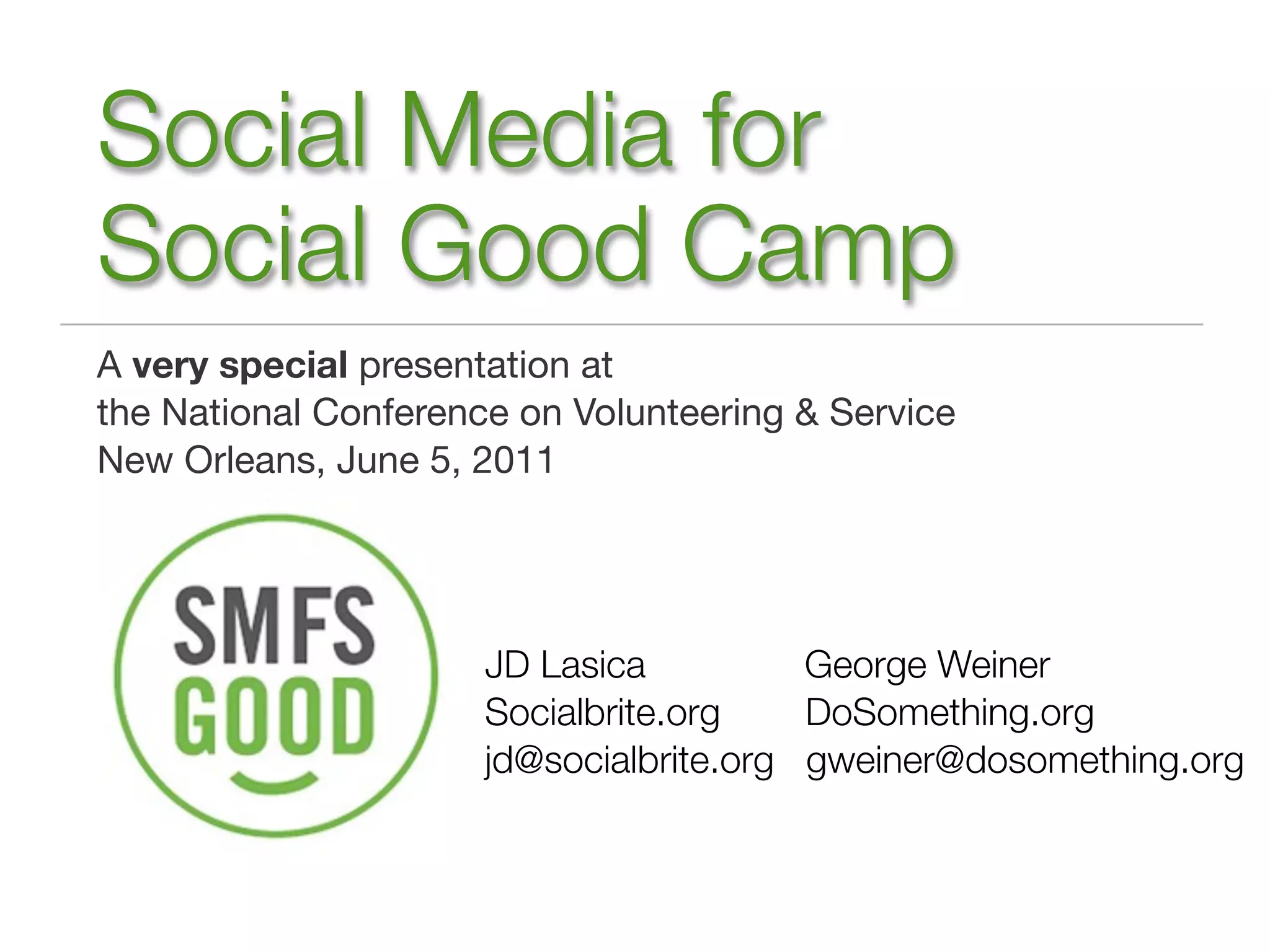 This document provides an overview of a presentation on using social media for social good. The presentation covers the social media ecosystem, core values and strategy alignment, metrics and analytics, cause campaigns that worked, steps to activate supporters, and community tools for social change. It includes case studies of successful advocacy campaigns and exercises for attendees. The goal is to help attendees understand how to effectively leverage social media to support their causes and organizations.