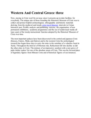 The Historical Museum of Crete aims to protect archaeological and historical materials while providing educational programs and exhibitions about Crete's history from early Byzantine times to the present. Key archaeological sites include the palaces of Knossos, Phaistos, Malia, and Zakros, with an emphasis on enhancing visitor engagement through updated displays. The museum also features significant artworks, including pieces by El Greco, and highlights the region's cultural and historical significance, particularly during the Ottoman period.