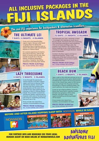 The document outlines various accommodation packages offered by Nomads for backpackers in Australia, New Zealand, and Fiji, highlighting amenities and services across different locations. It includes details on dormitory and private room options, adventure packages, arrival packages, and special discounts for travelers. Nomads aims to provide comfortable, budget-friendly lodging with a focus on social experiences and travel assistance for guests.
