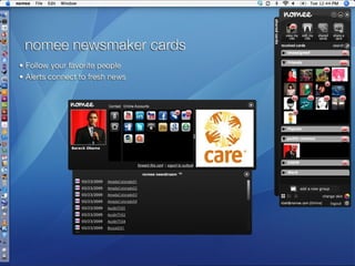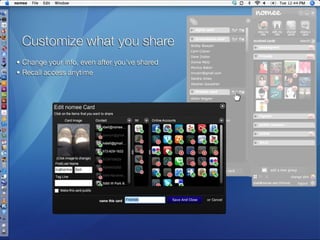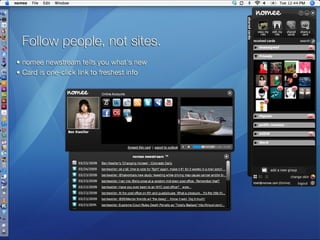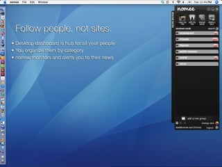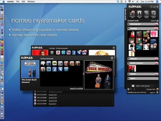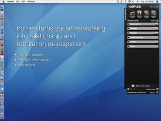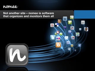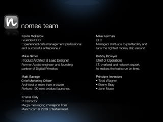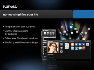 ![Please visit www.nomee.com Contact Marketing & Business Development: Matt Savage [email_address] Public Relations: Kristin Kelly [email_address]](https://image.slidesharecdn.com/nomeebetaintroduction-090402093957-phpapp01/85/Nomee-Beta-Introduction-26-320.jpg)