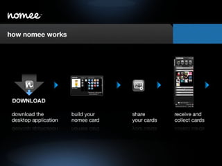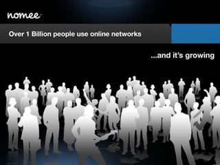 The nomee Business Opportunity provides brands with greater awareness, customer relationship management, and sales opportunities by leveraging existing social media traffic and 500 million users across multiple social networks. It functions as an "intersection" for all social media activity. There are three potential revenue models: 1) generating ad sales on cards, 2) charging fees or pay-per-view for relationship marketing and messaging tools for brands, and 3) charging fees for an enterprise tool allowing internal or external communications control by companies.