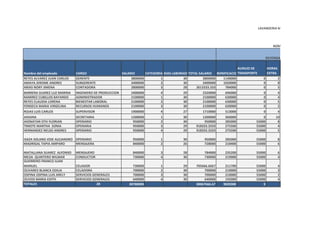 NOMINA 2009 DEVENGADO AUXILIO DE HORAS Nombre del empleado CARGO SALARIO CATEGORIA DIAS LABORADOS TRANSPORTE TOTAL SALARIO BONIFICACION EXTRA REYES ALVAREZ JUAN CARLOS GERENTE 3800000 1 30 3800000 1140000 0 2 AMAYA JEROME ANDRES SUBGERENTE 3400000 2 30 3400000 1020000 0 8 ARIAS NORY JIMENA CONTADORA 2800000 3 28 2613333.333 784000 0 5 BARRERA SUAREZ LUZ MARINA INGENIERO DE PRODUCCION 2400000 4 29 2320000 696000 0 4 RAMIREZ CUBILLOS BAYARDO ADMINISTRADOR 2100000 1 30 2100000 630000 0 4 REYES CLAUDIA LORENA BIENESTAR LABORAL 2100000 2 30 2100000 630000 0 5 FONSECA MARIA VIRGELINA RECURSOS HUMANOS 2100000 3 30 2100000 630000 0 2 ROJAS LUIS CARLOS EMELY VANEGAS MORENO SUPERVISOR 1900000 4 27 1710000 513000 0 4 JHOANA SECRETARIA 1200000 1 30 1200000 360000 0 10 JHONATAN STIV FLORIAN OPERARIO 950000 2 30 950000 285000 55000 8 TIMOTE MARTHA SONIA OPERARIA 950000 3 29 918333.3333 275500 55000 4 HERNANDEZ NELSO ANDRES OPERARIO 950000 4 29 918333.3333 275500 55000 5 ISAZA SOLANO JOSE ALEJANDRO OPERARIO 950000 1 30 950000 285000 55000 8 MADRIGAL TAPIA AMPARO MENSAJERA 840000 2 26 728000 218400 55000 6 MATALLANA SUAREZ ALFONSO MENSAJERO 840000 3 28 784000 235200 55000 6 MEJIA QUINTERO WILMAR CONDUCTOR 730000 4 30 730000 219000 55000 4 GUERRERO FRANCO JUAN MANUEL CELADOR 730000 1 29 705666.6667 211700 55000 4 OLIVARES BLANCA EDILIA CELADORA 700000 2 30 700000 210000 55000 3 OSPINA OSPINA LUIS ARELY SERVICIOS GENERALES 700000 3 30 700000 210000 55000 2 OLIVOS MARIA EDITH SERVICIOS GENERALES 640000 4 30 640000 192000 55000 4 TOTALES 20 30780000 30067666.67 9020300 0