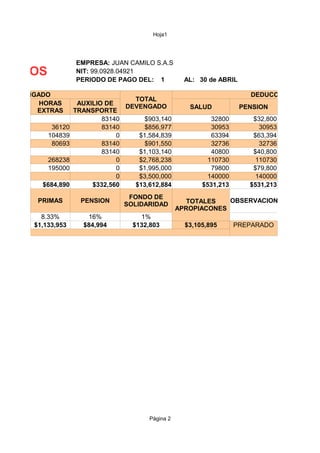 This document is a payroll sheet listing employee names, basic salaries, time worked, daily wages, commissions, health contributions, pension contributions, vacations, and totals paid. It summarizes the payroll period from the 1st to the 30th of April, showing amounts owed, deductions, and net amounts paid to each employee. The totals at the bottom of the sheet add up appropriations, contributions, and net amounts for the entire payroll.