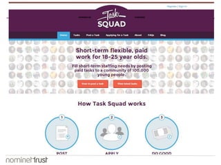 The Nominet Trust provides £5 million per year in social investments and grants. Their Social Tech Seed program provides up to £50,000 in funding and support to test ideas that use digital technology to address persistent social challenges. Applicants should have a tested team or MVP, commitment to testing their approach, and a plan to develop their product or activity within a year. The program aims to demonstrate how digital technology can redesign approaches to social issues.