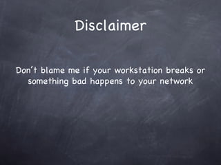 The document provides an overview of free and open source network security tools including Kismet for wireless monitoring, OpenVAS for vulnerability scanning, Metasploit for exploitation, and Nmap for port scanning and service detection. It discusses how these tools can be used both offensively to detect issues and defensively to harden networks, and highlights advantages like cost but also challenges like potential instability. The presentation focuses on demonstrating these tools and educating administrators about network security risks and defenses.