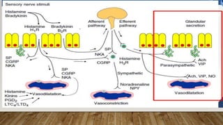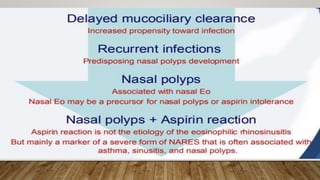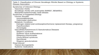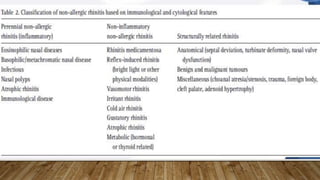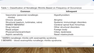 This document provides information about non-allergic rhinitis (NAR), including its various types and causes. It discusses vasomotor rhinitis as the most common form of NAR, accounting for at least 2/3 of cases. Other types include occupational rhinitis, hormonal rhinitis, food-induced rhinitis, and drug-induced rhinitis. It also describes NARES (non-allergic rhinitis with eosinophilia syndrome) which is characterized by nasal eosinophilia without evidence of allergy. The pathophysiology of NAR involves neurogenic mechanisms mediated by sensory C fibers and the autonomic nervous system leading to nasal inflammation and symptoms.