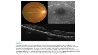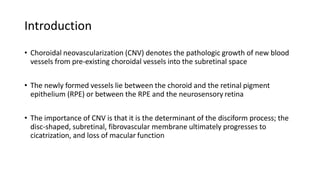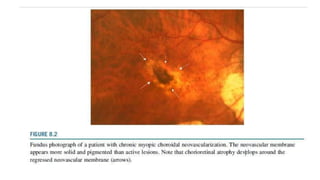 This document discusses non-AMD causes of choroidal neovascularization (CNV). It describes how CNV can be caused by degenerative diseases like high myopia, inflammatory diseases like uveitis, trauma, tumors, and idiopathically. For each cause, it discusses the pathogenesis, diagnosis using techniques like fluorescein angiography and OCT, and treatment options including anti-VEGF agents and laser photocoagulation. Radiance and MyrrOR trials showed effectiveness of anti-VEGF for treating myopic CNV specifically. CNV has various presentations and complications depending on the underlying cause.