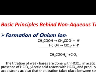 Non-aqueous titrations involve titrating substances in solvents other than water, primarily used for very weak acids and bases that are not soluble in water. Key precautions include ensuring no water in glassware, proper preparation of reagents, and controlling temperature during titration to minimize errors. Various solvents and titrants are detailed for accurate measurement, along with methods for standardization and titration procedures.