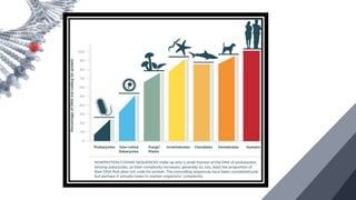 The document discusses non-coding DNA in eukaryotes, noting that a significant portion of an organism's genome consists of non-coding sequences, which were often labeled as 'junk DNA.' It categorizes various types of non-coding DNA, including functional RNAs, regulatory elements, introns, pseudogenes, repeat sequences, and telomeres, and highlights their biological functions such as genome protection and gene regulation. The document references several sources for further reading on non-coding DNA and its importance in genetics.