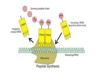 RNA serves various essential functions in biology. There are two main types: coding RNA (mRNA) which is translated into proteins, and non-coding RNA (ncRNA) which has regulatory functions but is not translated. Major ncRNAs include tRNA, which transports amino acids to the ribosome during protein synthesis, and rRNA, which along with proteins makes up the ribosome and catalyzes peptide bond formation. NcRNAs can regulate genes at the transcription or translation level. In eukaryotes, the majority of genomic transcripts are ncRNAs with diverse roles in splicing, translation, and gene expression control.