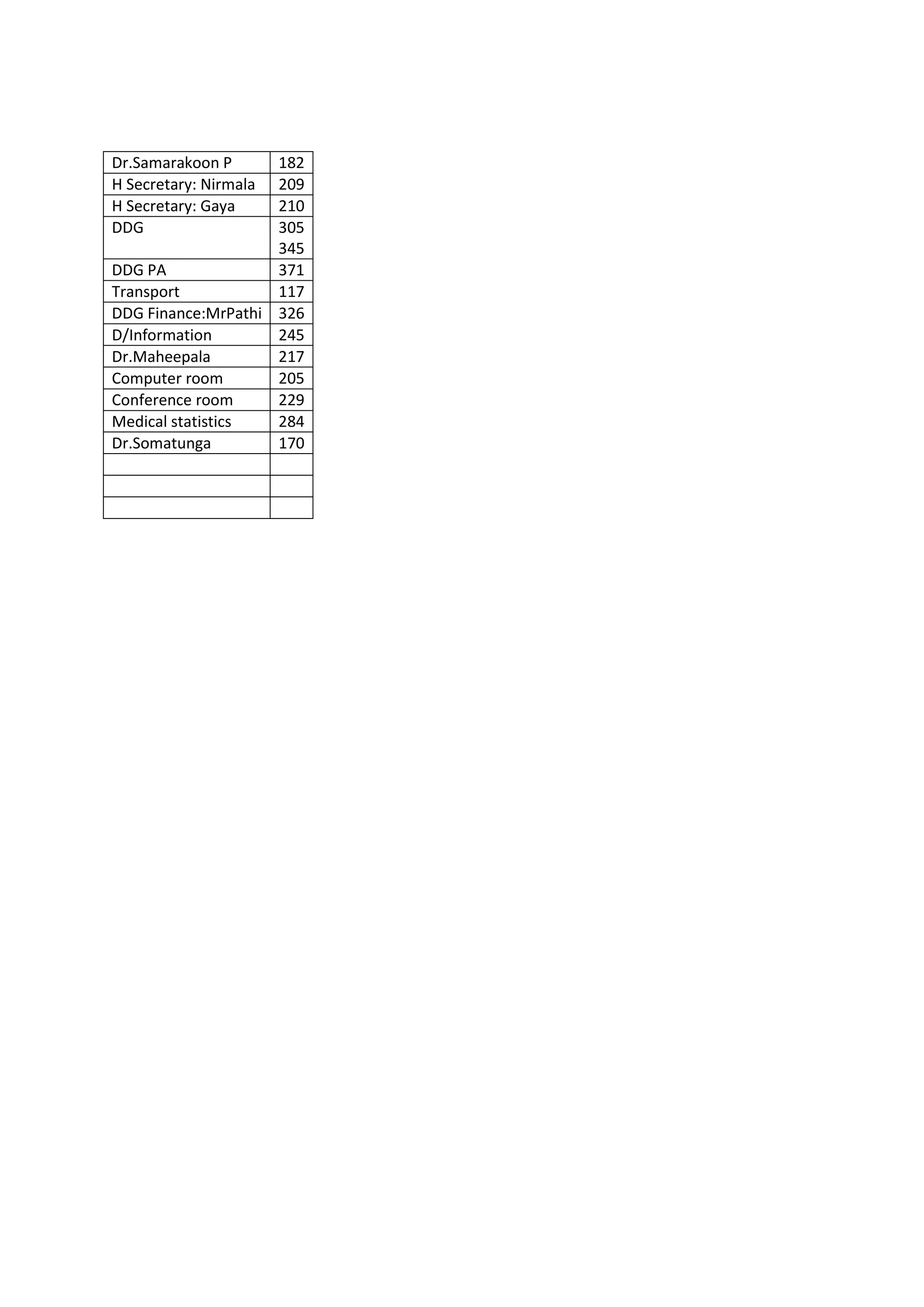 This document appears to list staff members and departments within an organization along with their room numbers. Key roles listed include two Deputy Directors General, a Head Secretary, Director of Information, and departments such as Transport, Finance, and Medical Statistics. Dr. Samarakoon, Dr. Maheepala, Dr. Somatunga, and their room numbers are also provided.