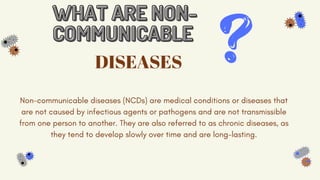 Non-communicable diseases (NCDs), also known as chronic diseases, are medical conditions that are not caused by infectious agents and are not transmissible between individuals. The document discusses three examples of NCDs - cardiovascular diseases, cancer, and chronic respiratory diseases - and provides details on their symptoms, risk factors, and potential complications. Cardiovascular diseases affect the heart and blood vessels and include conditions like heart disease and stroke. Cancer refers to diseases caused by uncontrolled cell growth and division. Chronic respiratory diseases impact the lungs, such as chronic obstructive pulmonary disease.