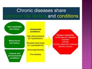 This document discusses non-communicable diseases (NCDs), which include cardiovascular diseases, cancer, diabetes, and chronic respiratory diseases. NCDs are the leading cause of death worldwide, responsible for over 36 million deaths annually. The main risk factors for NCDs are unhealthy diet, tobacco use, physical inactivity, and obesity. While genetics and family history can increase risk, behavioral and environmental risk factors can be modified to help prevent around three-quarters of NCD-related deaths through a healthy diet, regular exercise, and medical checkups. NCDs cannot always be cured but can be controlled and prevented through effective interventions targeting risk factors.