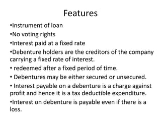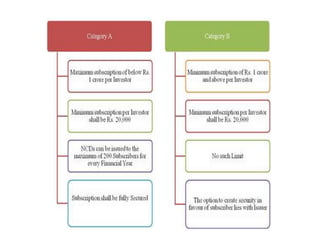 Non-convertible debentures (NCDs) are debt instruments issued by companies to raise funds for a fixed period with a commitment to repay the principal at the end. NCDs do not give voting rights to debenture holders and pay a fixed rate of interest. They can be secured against company assets or unsecured. NCDs are issued through public issues or private placements and traded on stock exchanges. Key parameters include coupon rate, face value, redemption, market value and yield. Companies must comply with regulatory requirements for issuing NCDs including credit ratings and debenture trustee oversight.