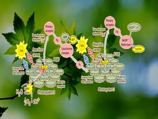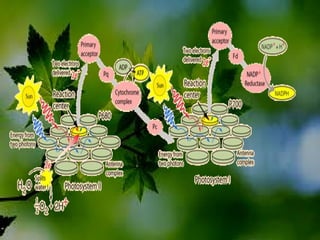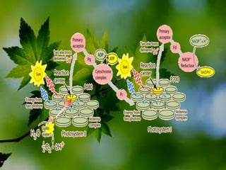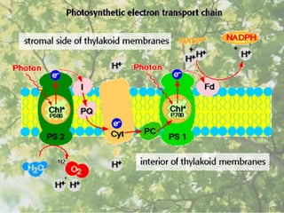 The document discusses the processes of non-cyclic and cyclic electron transport in photosynthesis, highlighting their roles in producing ATP and NADPH for the Calvin cycle. It explains the involvement of photosystems I and II, electron carriers, and the significance of photophosphorylation in energy conversion. Additionally, it notes how conditions in the chloroplast can lead to a shift from non-cyclic to cyclic electron flow when there's a deficit of ATP.