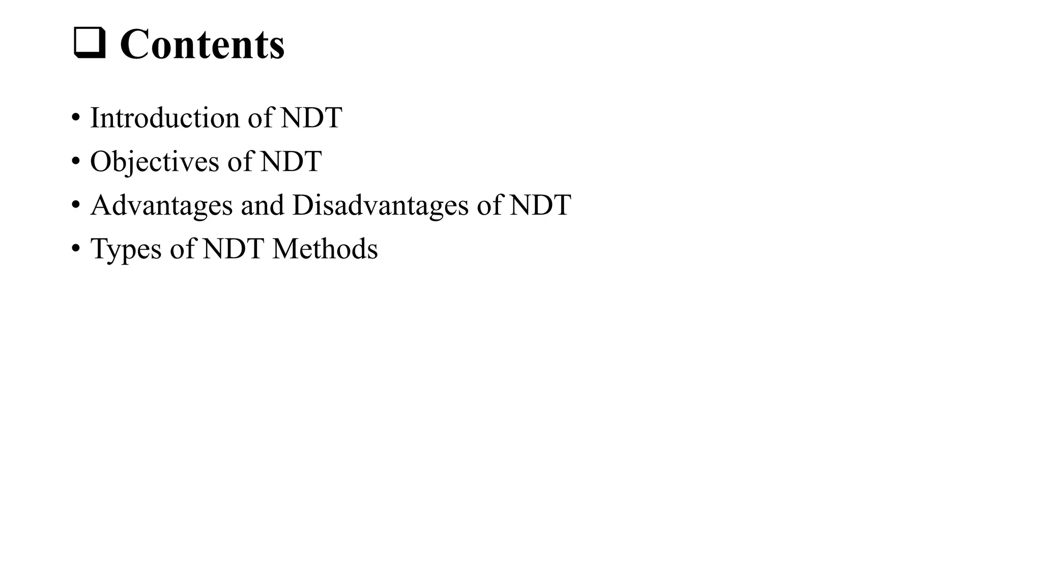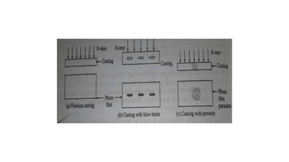 This document provides an overview of non-destructive testing (NDT) methods presented by Mr. Ruturajsinh Gurav. It describes NDT as testing materials without destroying them to detect flaws. The objectives of NDT are outlined as detecting internal/surface flaws to prevent failure and evaluate material properties. Various NDT methods are introduced, including visual inspection, liquid penetrant testing, radiography, ultrasonic testing, magnetic particle testing, and eddy current testing. Advantages and disadvantages are listed for each method.