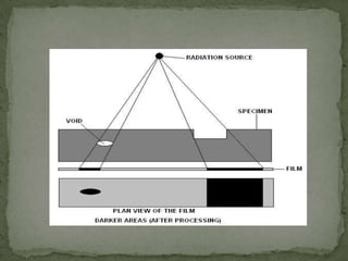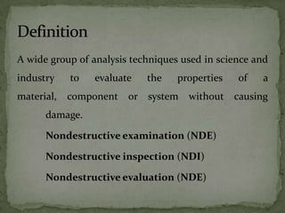 This document discusses nondestructive testing (NDT), which is a group of analysis techniques used in science and industry to evaluate materials, components, or systems without causing damage. Various NDT methods rely on electromagnetic radiation, sound, or inherent material properties to examine samples for flaws. Common NDT techniques mentioned include ultrasonic testing, magnetic particle inspection, dye penetrant inspection, radiographic testing, and eddy-current testing. These techniques are widely used across various industries such as aerospace, mechanical, civil, and electrical engineering.