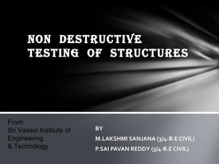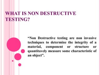 Non-destructive testing (NDT) techniques allow inspection of materials, components, and structures without damaging them. Common NDT methods for structures include ultrasonic testing, rebound hammer testing, and radiographic testing. Ultrasonic pulse velocity testing measures the speed of ultrasonic pulses traveling through concrete to evaluate its quality and homogeneity. The rebound hammer test uses the rebound of an elastic mass to estimate the surface hardness and approximate compressive strength of concrete. NDT techniques provide cost-effective quality control and safety assessments for structures.